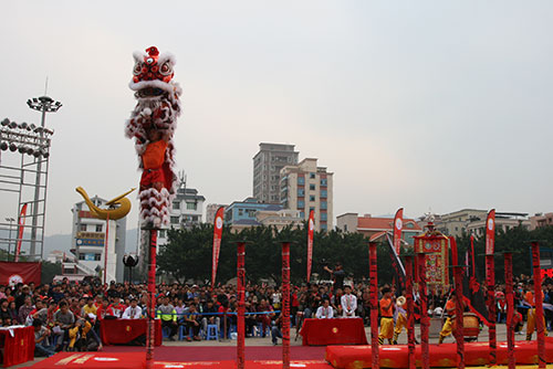 高桩比赛展示出南狮高超技巧。(于红立摄)